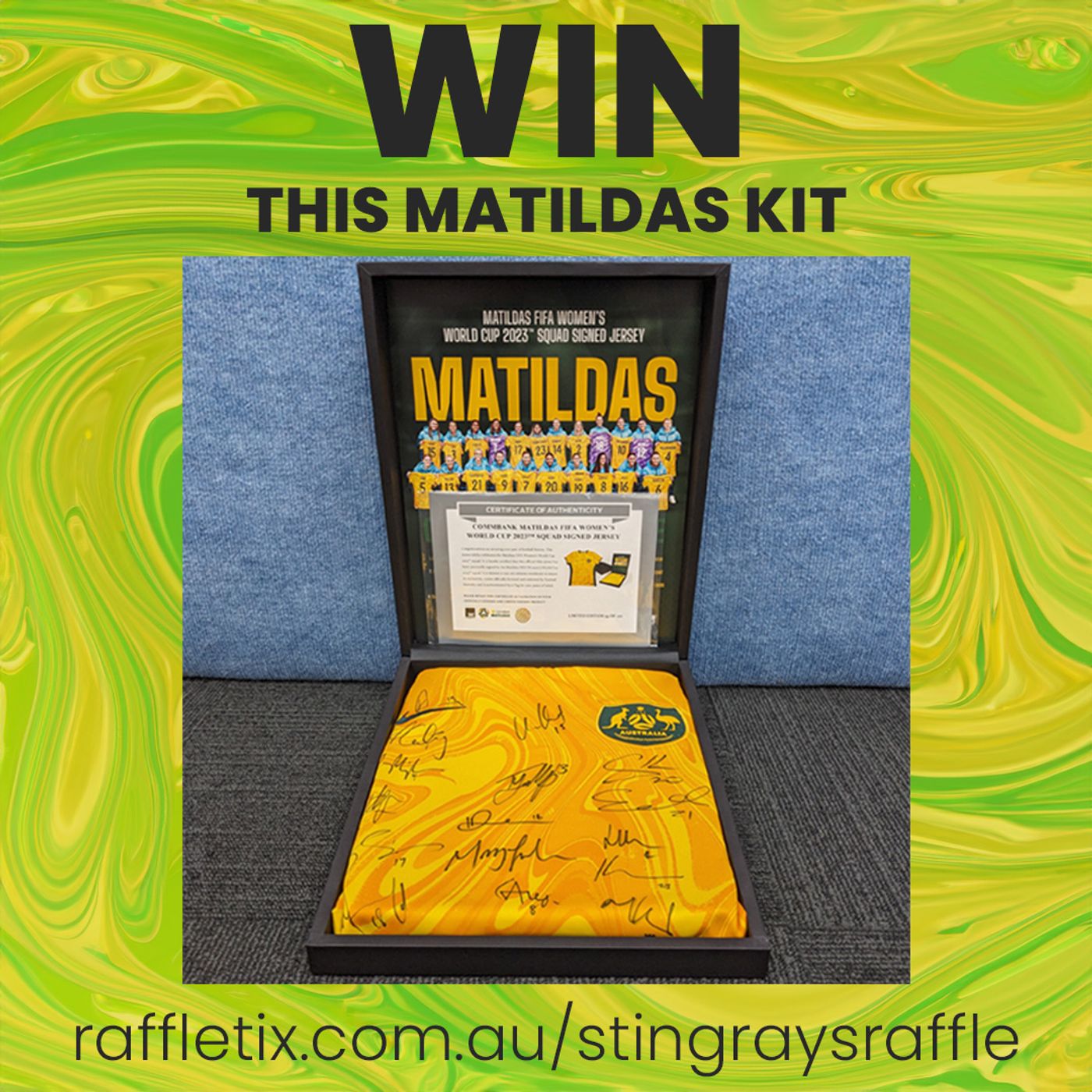 See full terms and conditions at https://www.illawarrastingrays.com.au/win-matildas-kit-and-wwc23-memorabilia-stingrays-raffle/